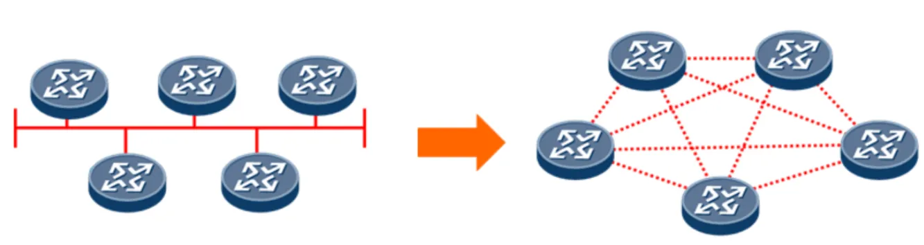 n台路由器需要建立n (n-1)/2个邻接关系,这会造成大量的重复 LSA 泛洪,极大地浪费网络资源和设备 CPU 资源。
