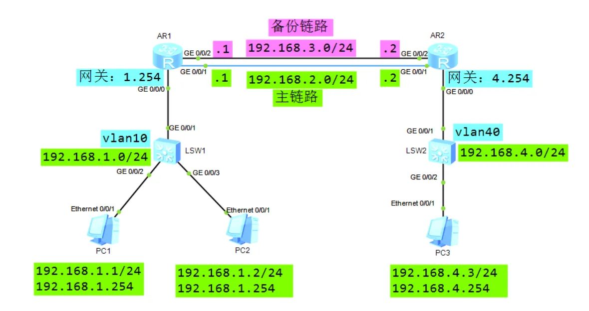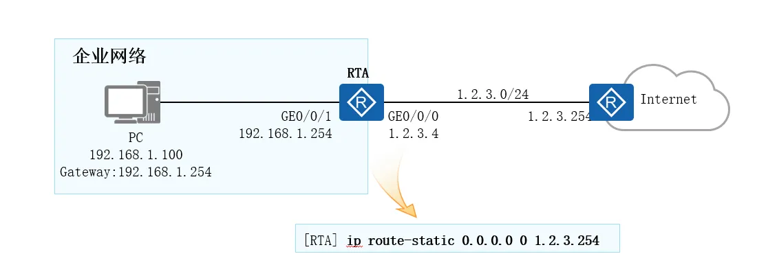 - 配置回程静态路由:添加 192.168.1.0/24 网段路由,下一跳指向 R1(192.168.2.254)