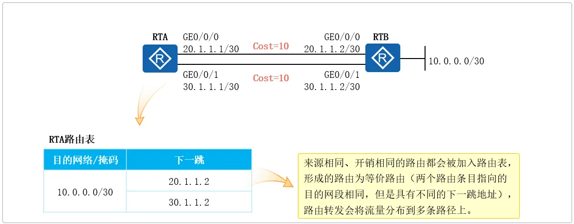 针对同一目的地,可能存在不同下一跳、出接口等多条路由 | |