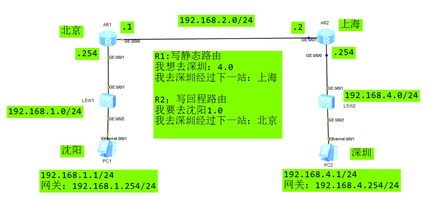 因为是跨网段通信,也叫非直连网段通信,所以我们使用静态路由